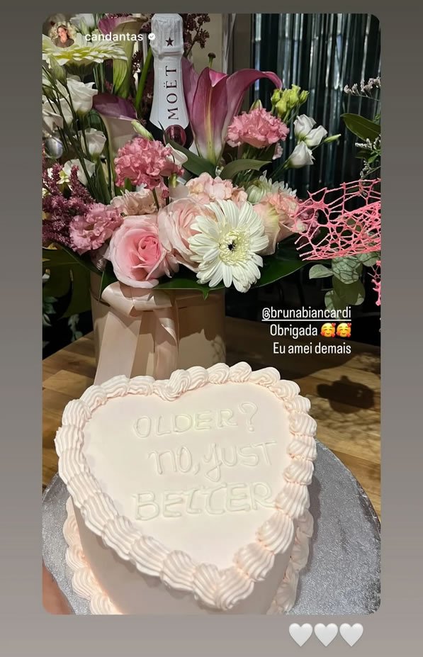 A celebração de Carol Dantas ganhou um toque especial com os mimos enviados por Bruna. O destaque foi um bolo em formato de coração que carregava uma mensagem divertida: “Older? No, just better” (que se traduz como ‘Mais velha? Não, apenas melhor’). O presente açucarado foi acompanhado de um belíssimo buquê de flores — composto por gérberas, hortênsias, rosas e lírios em tons de rosa — e uma garrafa de espumante para brindar o novo ciclo.
